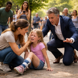 A small crowd had formed there, the usual shape of public curiosity: people leaning in, phones half-raised, unsure whether they were witnessing tragedy or entertainment. A woman knelt on the cold stone edge of the fountain, her hands shaking as she tried to lift a little girl—maybe six years old—whose legs were folded strangely beneath her. The girl’s cheeks were wet, her breath coming in fast, broken pulls.