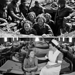 It was a storage chamber—low ceiling, shelves pushed against the walls, crates stacked like a half-built maze. There were blankets on the floor. A bucket in the corner. A pile of empty tins. And in the center, huddled together like people in a storm, were women in worn uniforms and civilian coats, hair tangled, faces pale in the sudden light.