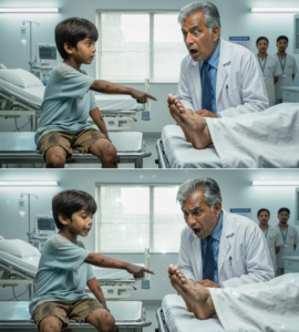 He stood near the back wall of the hospital corridor, barefoot despite the cold, his jacket three sizes too big and torn at the elbows. His hair was matted, his face smudged with dirt and old bruises that had long since stopped surprising anyone who looked closely enough to care. People passed him as if he were part of the paint on the wall—unremarkable, invisible, expected to be there and ignored.