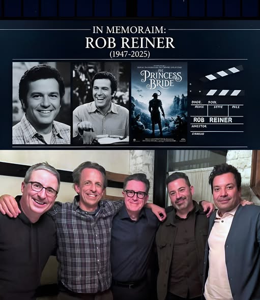 In an unprecedented display of solidarity, the four major late-night talk shows transformed into solemn platforms of mourning on December 15, 2025, just one day after the shocking deaths of filmmaker Rob Reiner and his wife, Michele Singer Reiner. Stephen Colbert, Jimmy Kimmel, Jimmy Fallon, and Seth Meyers each set aside their signature humor to deliver heartfelt tributes to the beloved director of classics like “The Princess Bride,” “When Harry Met Sally…,” and “This Is Spinal Tap.” What started as rival comedy programs became a unified moment of raw emotion, stunned silence, and personal reflections that left audiences deeply moved.